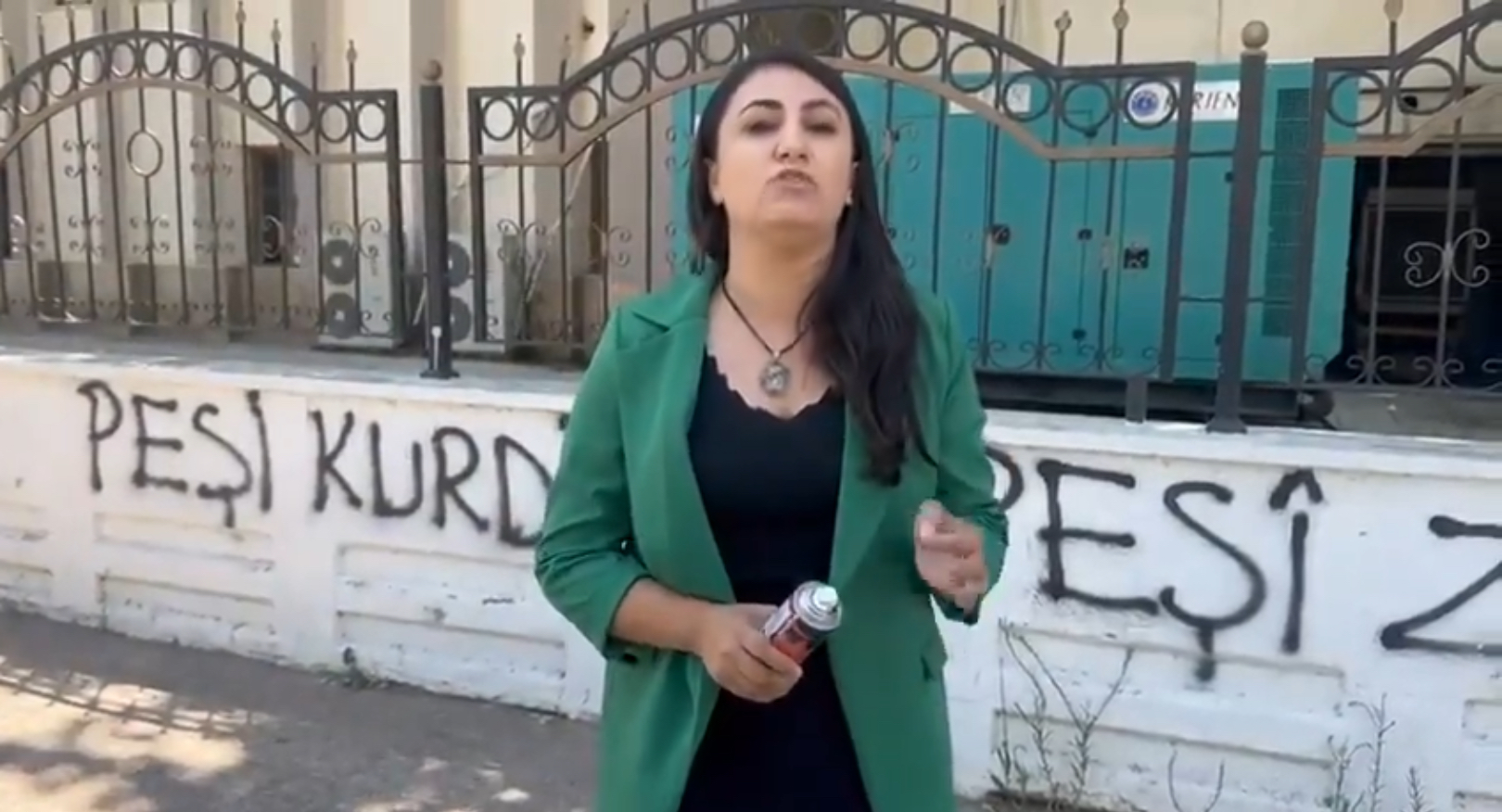 DEM Parti Batman Milletvekili Zeynep Oduncu, Batman’da Kürtçe uyarı yazılarının silinmesine tepki amacıyla Batman Valiliği’nin duvarına sprey boyayla “Pêşî Kurdî pêşi ziman” (Önce Kürtçe, önce dil) yazdı.